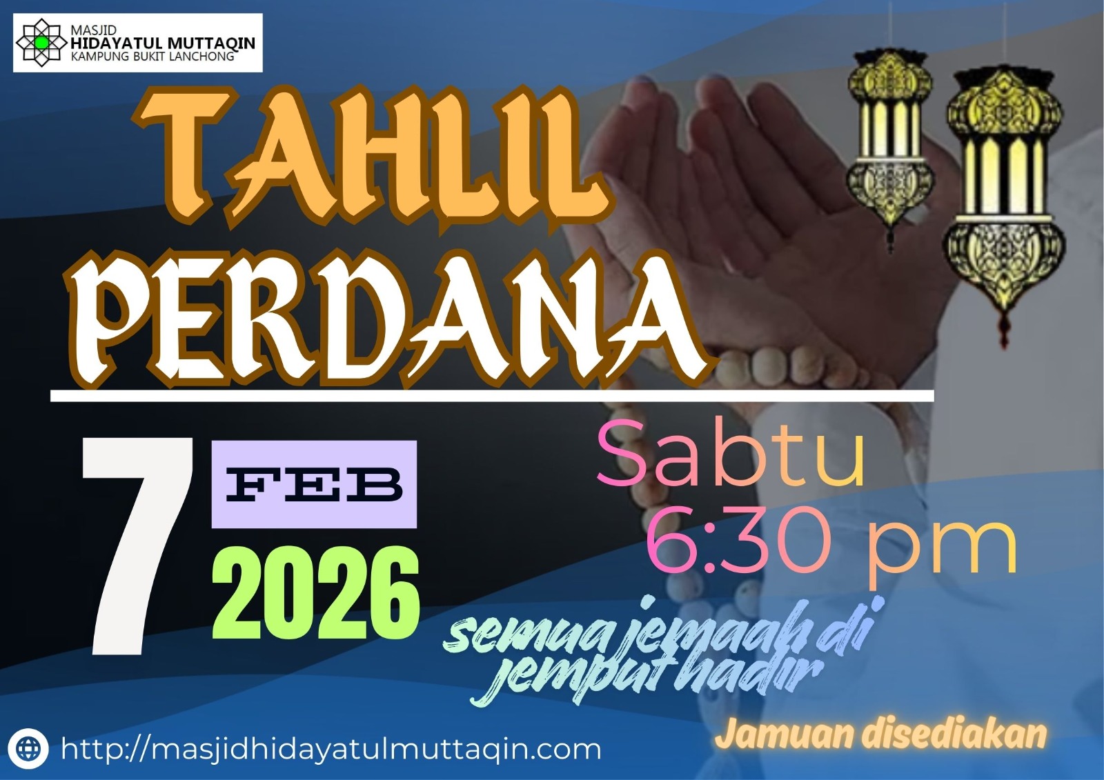 Tahlil perdana akan diadakan bermula jam 6.30pm sehingga selepas maghrib. Sila berhubung dengan AJK masjid untuk keterangan lanjut